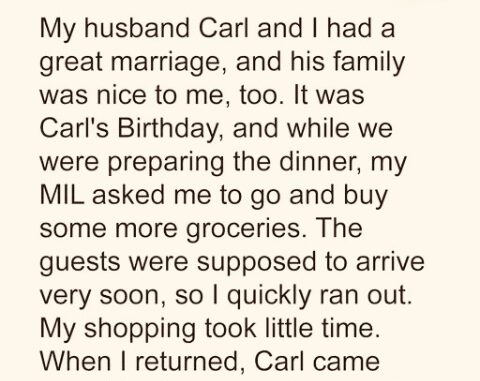 On my husband Carl’s birthday, his mother sent me out for groceries, then told guests I’d left because I was upset. Carl believed her and accused me of ruining the day. When I finally explained, he realized the truth, apologized, and confronted his mother. She also apologized. We learned to talk to each other before assuming the worst.