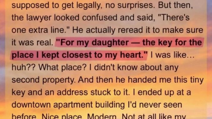 But then, the lawyer looked confused and said, “There’s one extra line.” He actually reread it to make sure it was real. “For my daughter – the key for the place I kept closest to my heart.” I was like… huh?? What place?