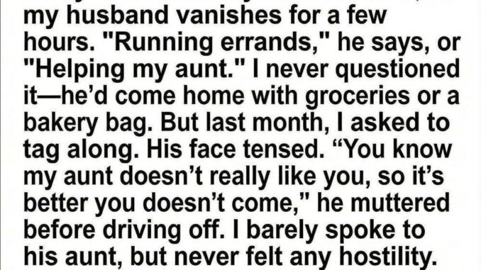 Inside was his fragile aunt, living alone with signs of a life unraveling—medical supplies, unopened mail, quiet exhaustion. He’d been visiting every month to clean, cook, handle appointments and medications, manage insurance, and sit with her through loneliness. She’d asked him not to tell anyone, and he honored her dignity even if it created distance between us. We didn’t fight—we talked, honestly, about fear and pride, and I understood that silence isn’t always deceit; sometimes it’s love carried alone. Trust, I realized, also means building a space where your partner doesn’t have to carry their heaviest truths by themselves.