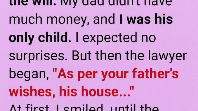 My father passed away, and his lawyer called me to read the will. He didn’t have much money, and I was his only child. I expected no surprises.