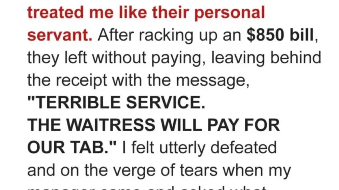 When a family skipped out on their $850 bill, I was devastated. They were loud, entitled, and rude from the moment they walked in, snapping fingers, complaining about everything, and treating me like I was invisible. By dessert, they vanished—leaving a note: “Terrible service. The waitress will pay.”
