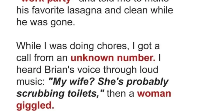 Later that day, I received a call from an unknown number. Through music and laughter, I heard Brian’s voice mocking me: “My wife? She’s probably cooking and scrubbing toilets. She’s so predictable.” A woman giggled beside him. Then the call ended, followed by a text with an address.