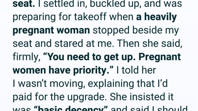 She said it was “basic decency,” that anyone with a conscience would give up their seat for a pregnant woman. I kept my voice calm, even though my heart was pounding. “I understand you’re uncomfortable,” I said, “but upgrades have priority.