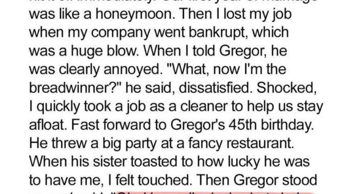 When Abby lost her job, she expected Gregor’s support. Instead, his patience faded into criticism. She took a temporary cleaning job to help, but his remarks about her work and appearance hurt deeply.