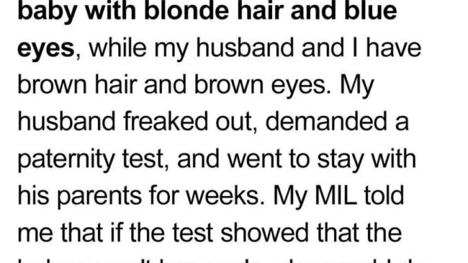 I gave birth five weeks ago to a baby with blonde hair and blue eyes, while my husband and I have brown hair and brown eyes. My husband freaked out, demanded a paternity test, and went to stay with his parents for weeks. My MIL told me that if the test showed that the baby wasn’t her son’s, she would do anything so that I was “taken to the cleaners” during the divorce.