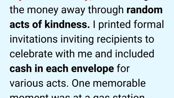 I had formal invitations printed—real invitations, with gold accents and elegant lettering—“inviting” the recipient to celebrate my birthday with me. Inside each envelope, I tucked cash in various amounts, depending on the act of kindness I planned. Then, on the morning of my birthday, I set out with fifty envelopes and a mission: to give them all away through fifty random acts of kindness.