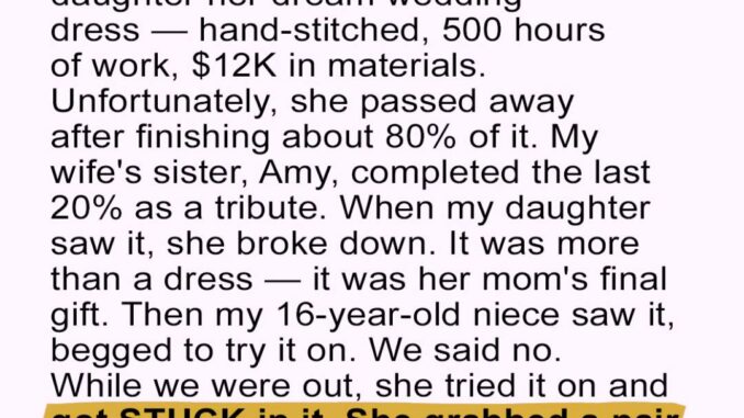 My late wife, Linda, spent 500 hours hand-sewing a $12,000 wedding dress for our daughter, Sammy, as her final act of love before passing from cancer. After her death, my sister Amy completed the dress, turning it into a treasured symbol of her mother.