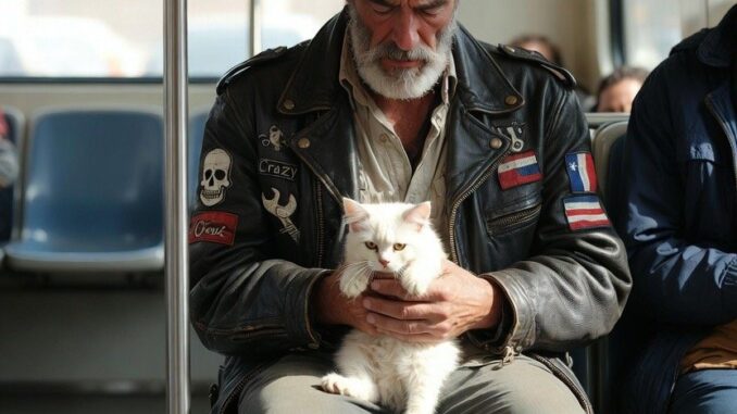 The biker sitting across from me on the subway was crying. Not just tearing up—full-on sobbing into a tiny orange and white kitten pressed against his chest. His leather vest was covered in patches, his hands were scarred and rough, and his beard was streaked with gray.