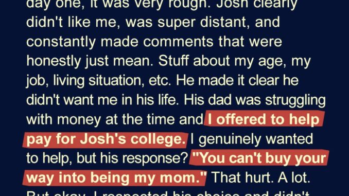 When her hostile stepson cruelly rejected her offer to fund his college—spitting out, “You can’t buy your way into being my mom”—she stepped back and let him go. Five years later, he calls with major news and a bold request that knocks the wind out of her. I’d been married to David for five years when his 16-year-old son, Josh, moved in with us.