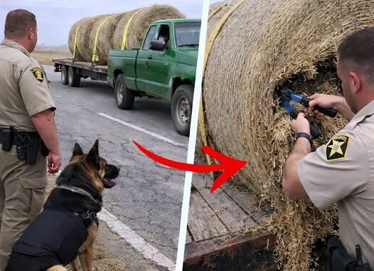 Miller led Duke out of the cruiser. The Malinois was a dual-purpose dog, trained in narcotics detection and tracking. As Duke circled the truck, his behavior shifted. Instead of going for the usual hiding spots, he lunged toward the center bale on the trailer. The dog didn’t give his typical silent sit alert for narcotics; instead, he began a frantic barking and clawed at the wooden flatbed. It was a “living find” alert—the unmistakable sign of a human presence.