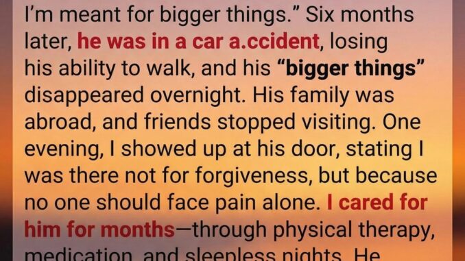Six months later, news reached her that changed everything. The man who once spoke so confidently about ambition had been seriously injured in a road accident, leaving him unable to walk and largely alone. Many of the people who once surrounded him had moved on, and his family was far away. After days of hesitation, she chose to visit—not to revisit the past or reopen old wounds, but because compassion felt stronger than resentment. She made it clear from the beginning that she was there simply so he would not face recovery alone.