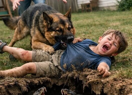 Titan had his jaws clamped firmly on the back of Caleb’s T-shirt, dragging him across the grass in urgent, rough pulls. Caleb’s small hands scraped against the lawn as he tried to regain balance. Each movement seemed uncoordinated, chaotic—but the boy’s cries were punctuated by Titan’s firm, purposeful restraint.