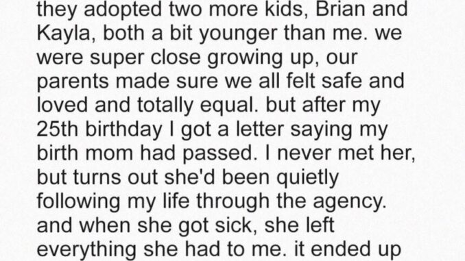 At 25, Taylor learns her birth mother, Alina, has died and left her $187,000. Expecting support, she instead faces resentment from her adoptive siblings, Brian and Kayla, who demand she split the inheritance. Her parents refuse to defend her, urging compromise.
