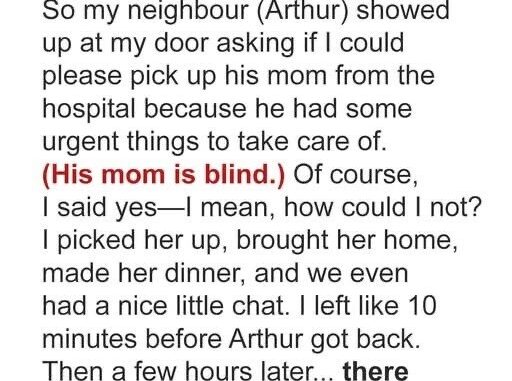 I learned the hard way that kindness can backfire. When I agreed to help my neighbor, Arthur, by picking up his blind mother, Maria, from the hospital, I never imagined it would end with police at my door accusing me of theft. Arthur had always made me uneasy with his rehearsed politeness, while his mother, Maria, radiated genuine warmth.