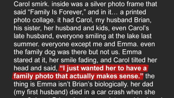 I once overheard her call me “damaged goods” and Emma “extra baggage.” Brian defended us, but her disapproval never faded. At Emma’s ninth birthday, Carol gave her a silver frame engraved “Family Is Forever.” Inside was a collage from our last trip—everyone included except Emma and me. Emma’s smile vanished as Carol smugly added, “I wanted her to have a family photo that makes sense.”