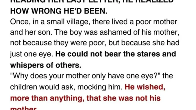 In a small village lived a poor mother and her son. The mother, Mercy, had only one eye, and her son Rock was ashamed of her. Children at school mocked him, calling his mother a “one-eyed witch,” and the shame made him resent her.