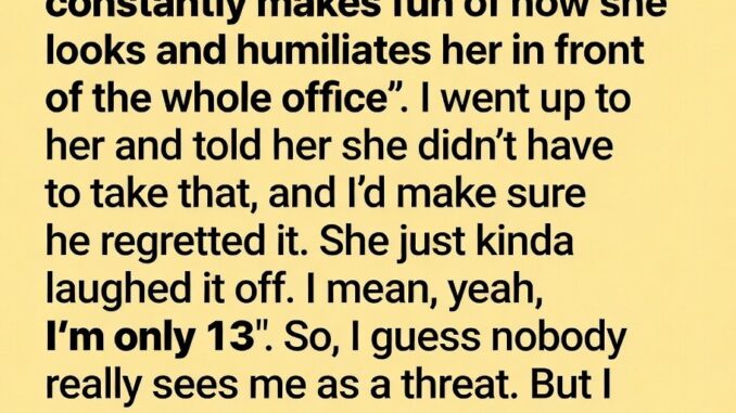One night, I overheard Mom crying on the phone to Grandma. Her boss, Richard, had mocked her thrift store clothes in front of her coworkers, belittling her and making her feel worthless. My heart broke, and anger bubbled inside me.
