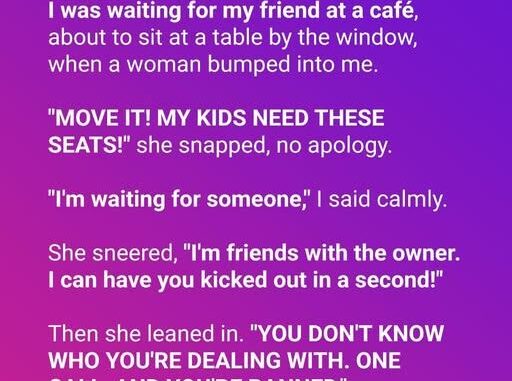 I was waiting for my friend at a cafe, about to sit at a table by the window, when a woman bumped into me. “MOVE IT! MY KIDS NEED THESE SEATS!” she snapped, no apology.”I’m waiting for someone,” I said calmly.