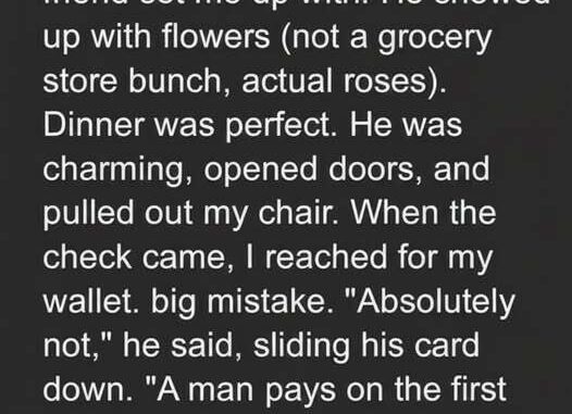 When the check arrived, I reached for my purse out of habit. “Absolutely not,” he said as he placed his card down before I could even unzip it. “I pay on the first date.”